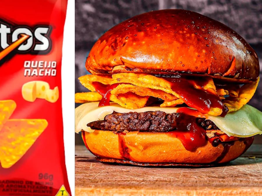 Pão de brioche, hamburquer 180g, mussarela, Doritos, molho barbecue.